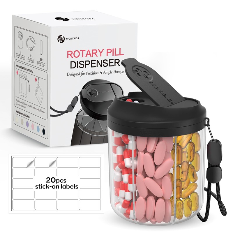 - Easy to use: Hionxmga pill storage box has a flexibly rotating lid and a wide opening, and has exclusive detent mechanism design ensures precise alignment of the compartment opening with the pill dispenser outlet after the rotation is completed. These advantages not only make the loading and taking of pills more convenient and the distribution more accurate, but also avoid the medicine from contacting external contamination. Ensure that each time you take the medicine is efficient and hygienic.