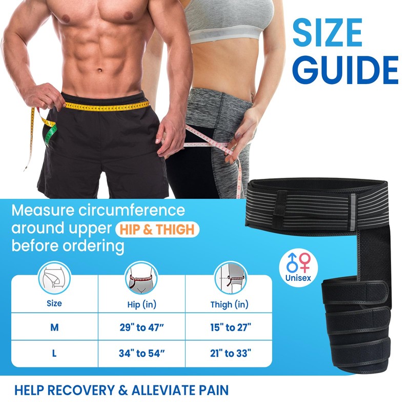 - What You'll Receive: A black, adjustable hamstring and thigh compression sleeve (L size) with a clear instruction manual for easy application. It can be used on either hip/thigh. Our customer service team is available 24/7 to assist you with any questions about the groin compression wrap or hip brace.