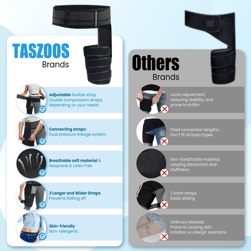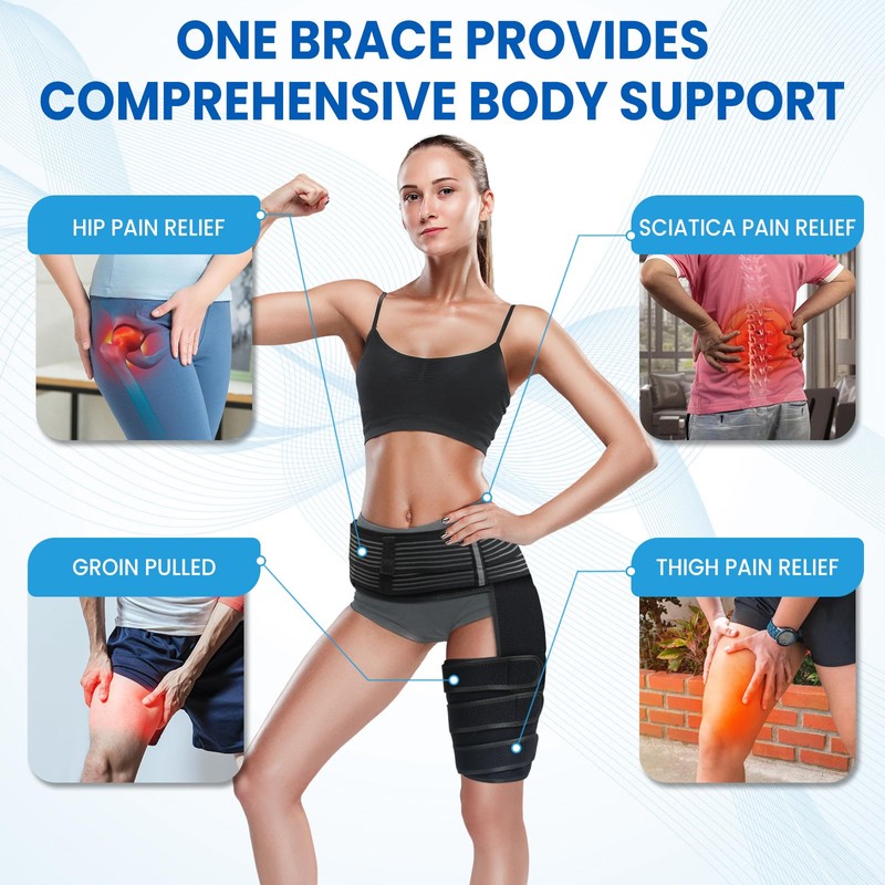 - Relieve Hip and Thigh Pain: This dual-action sciatica pain relief device provides compression, stability, and support for your hips, thighs, and lower back. As a hip brace, it helps alleviate sciatica pain, thigh strains, quadriceps/hamstring injuries, and more, enhancing your mobility.