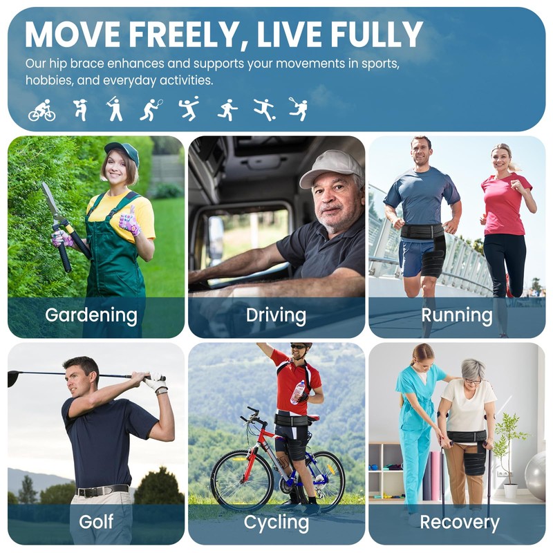 - Unisex & Adjustable Fit: This hip brace for men and hip brace for women features dual compression bands and three straps for easy pressure adjustment. The hip stabilizer fits hip circumferences of 34"-54" and thigh circumferences of 21"-33", making it suitable for both men and women. It can be worn under or over clothing.