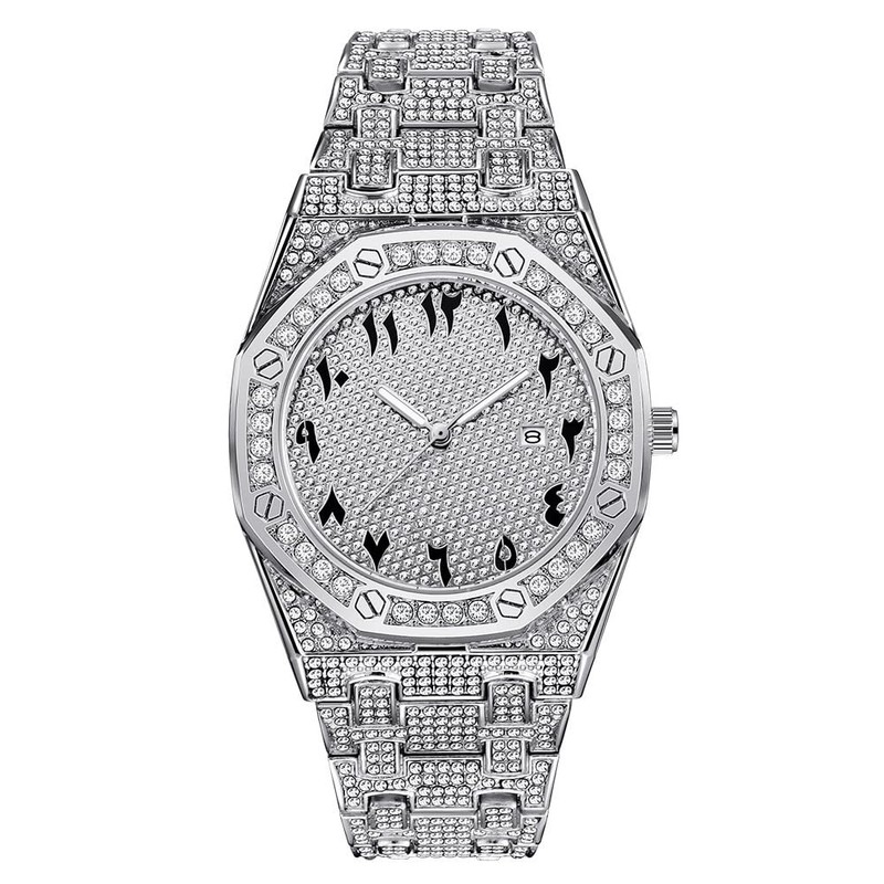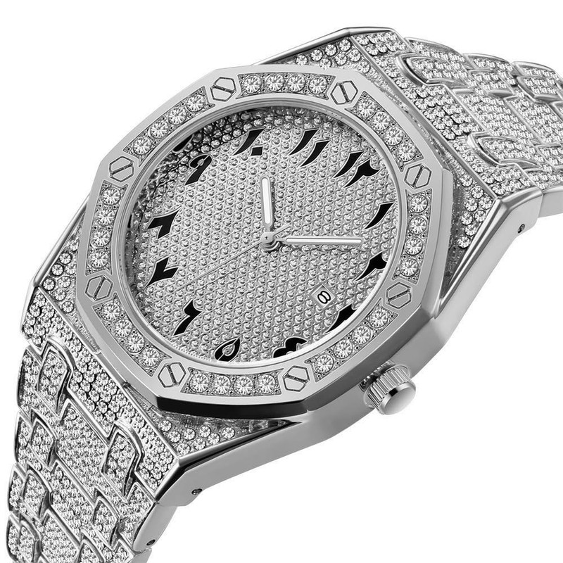 Hip Hop Watches for Men Octagon Iced-Out Bling Diamond Luxury Quartz Watches with Date (Silver)