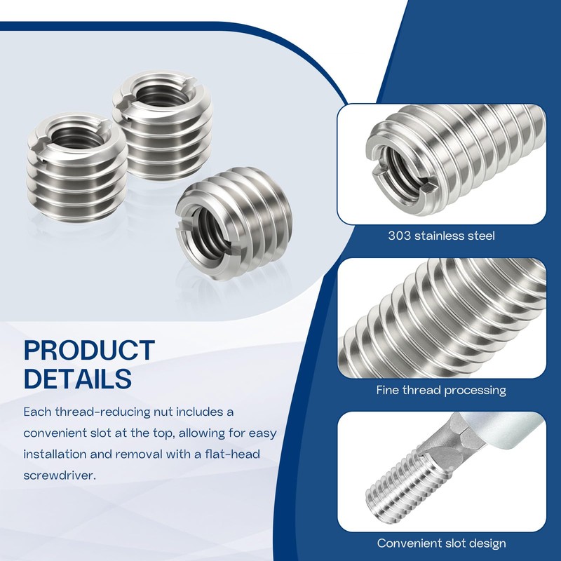 - Feature: Each thread-reducing nut includes a convenient slot at the top, allowing for easy installation and removal with a flat-head screwdriver. Designed for simplicity and efficiency in handling. Features a smooth surface with deep, clear threads for even force distribution.