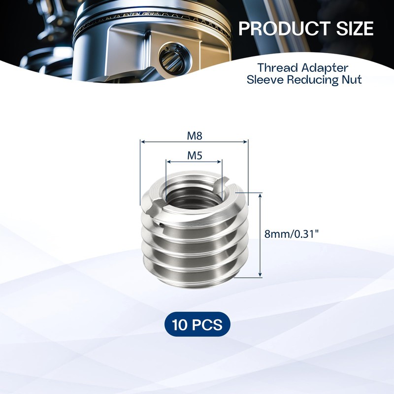 - Specification: Male Thread Size: M8 x 1.25; Female Thread Size: M5 x 0.8; Length: 8mm / 0.31 inch; 10 Pack x Threaded Inserts