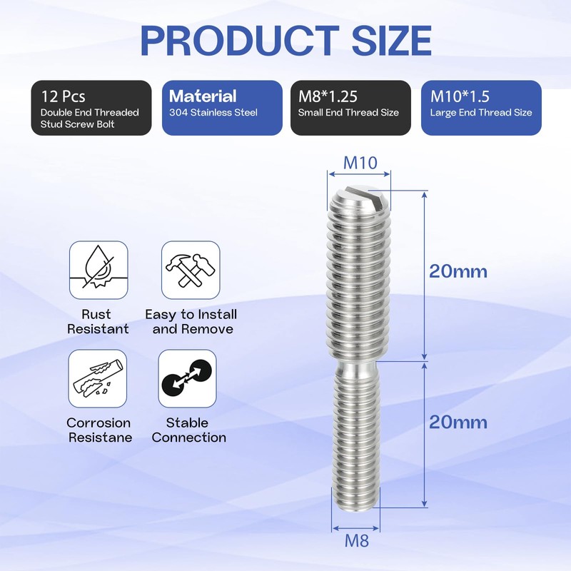 HiPicco M8x20mm to M10x20mm Double End Threaded Stud Screw Reducing Bolt,304 Stainless Steel Thread Reducer Adapter for Furniture Fastener Welding, Hardware Connectors 12 Pack