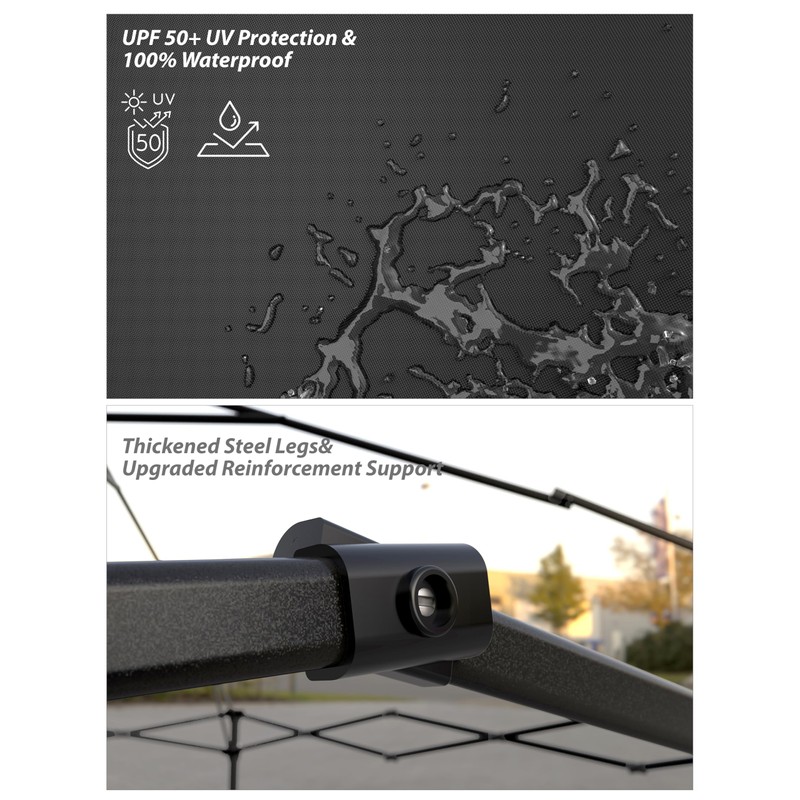 - WATERPROOF & SUN PROTECTION: Our pop up canopy is made of 210D Oxford fabric with a silver-coated canopy fabric providing UPF 50+ UV protection. The CPAI-84 flame-retardant fabric is waterproof, ensuring long-lasting durability.