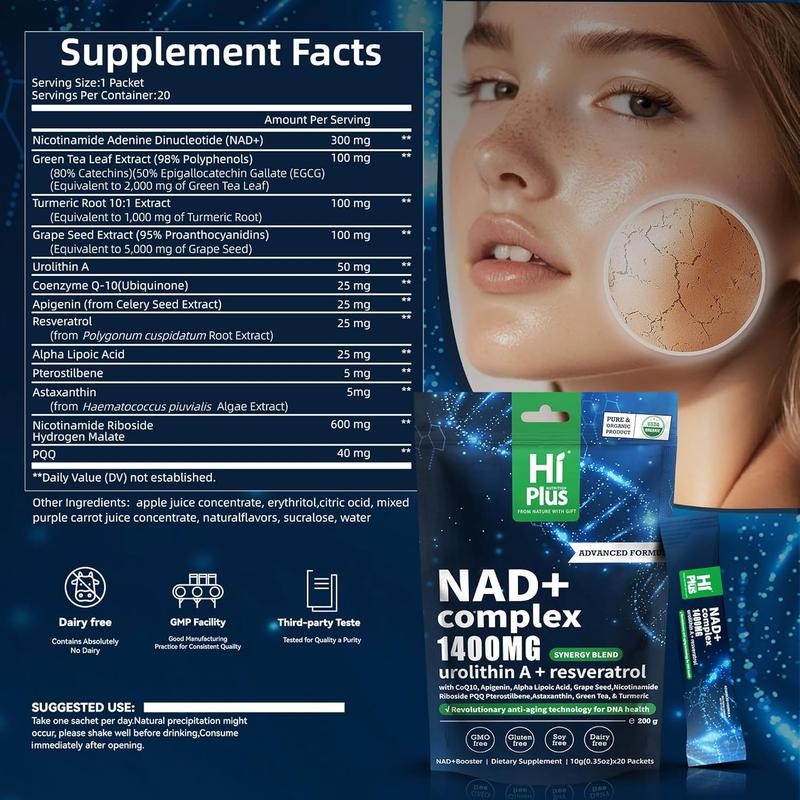 HiPlus NAD+ Cell Regenerator is an advanced anti-aging and wellness drink designed to support cellular energy, metabolism, and overall vitality. Each serving delivers 1400 mg of NAD+ support in a potent, extra-strength formula, enriched with Resveratrol, CoQ10, PQQ, Alpha Lipoic Acid, Green Tea, and Astaxanthin. This berry-flavored, liposomal drink helps boost energy, support healthy aging, and promote skin, beauty, and cellular health for both women and men.