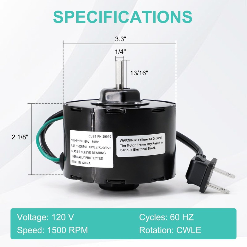 - JA2C028G Motor Specifications - Volts: 120 V, Amps: 0.6 A,Cycles: 60 HZ, RPM: 1500. Haft Rotation: CWLE. Motor: 3.3" x 2-1/8", Shaft: 1/4'' x 13/16''. Please check size and compatible models before ordering to ensure it matches your fan
