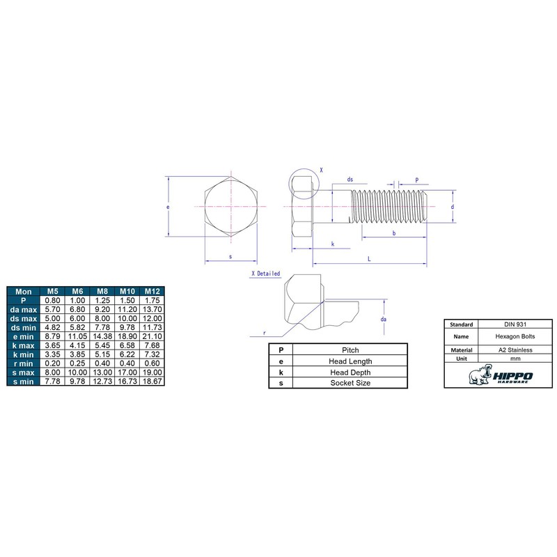 Hippo Hardware M12 (12mm X 150mm) Hexagon Head Bolts Part Threaded Hex Bolt A2 Stainless Steel DIN931 (Pack of 3)