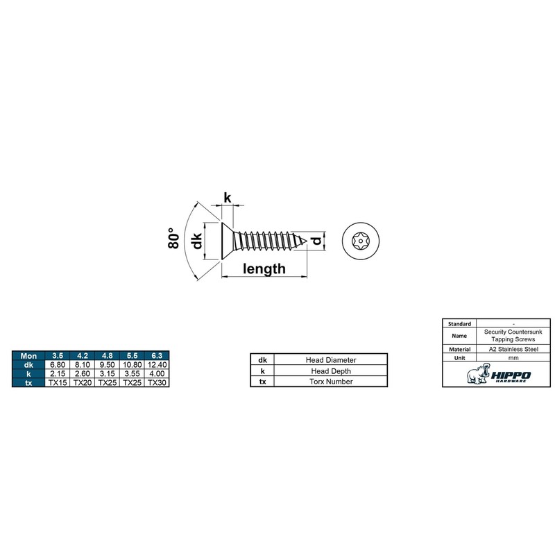 Hippo Hardware No.6 (3.5mm X 25mm) Countersunk Security Wood Screws Torx Anti Tamper Vandal Self Tapping A2 Stainless Steel (Pack of 30)