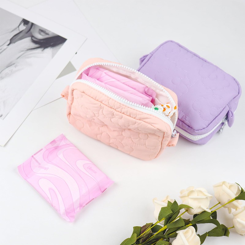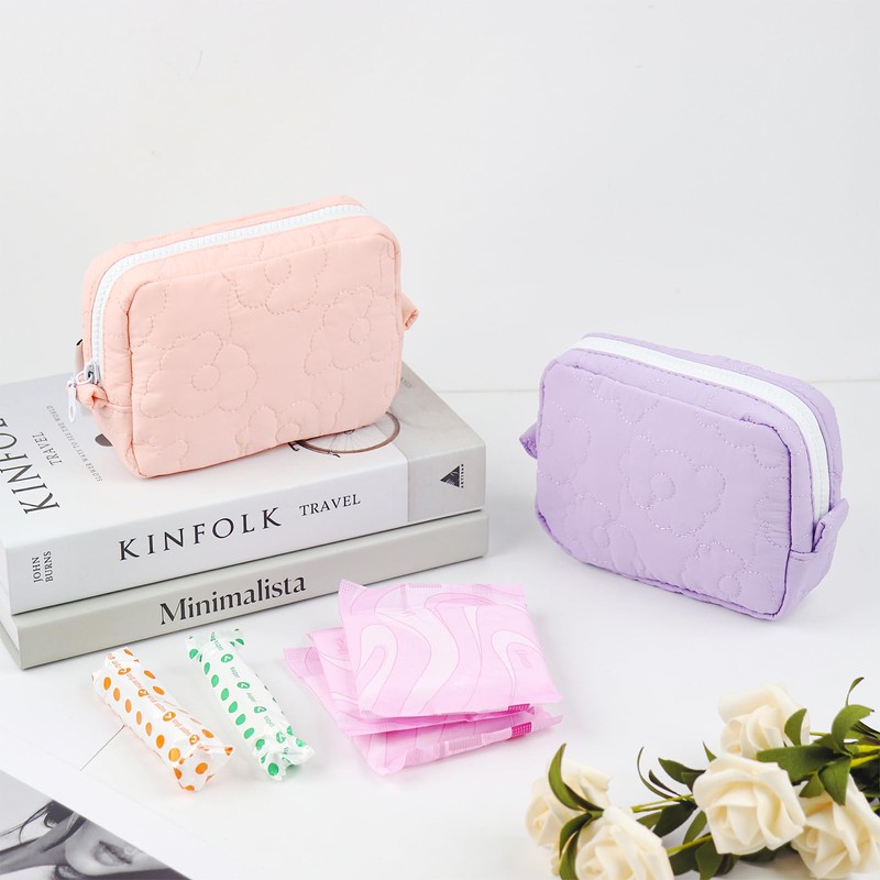 Hipruict Tampon Bag for Purse, 2 Pcs Quilted Sanitary Pad Pouch, Keeping Discreet Feminine Products, 6.3" x 1.6" x 5.1" (Pink and Purple)