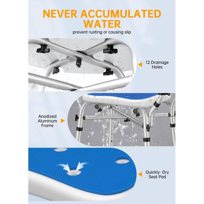 - Efficient Drainage for Clean and Comfort: With 12 strategically placed drainage holes, this shower seats for adults prevents water from accumulating, keeping bath chair quick dry and tidy, ensures a cleaner, safer showering experience for you or your parents