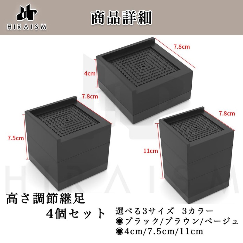 - Achieve the ideal height. Convenient L-frame Design: This 4-piece set of HIRAISM "supplement" allows you to find the perfect height to fit your furniture and needs. Stackable blocks can be applied to a wide range of furniture including tables, sofas, beds, kotons, shelves, and more. The main unit is made of lightweight and high quality PP material, which is sturdy enough to withstand more than 110.2 lbs (500 kg), so it can be used even with heavy furniture. Furthermore, HIRAISM is a carefully designed L-frame that can be used with items that have legs, but also household appliances without feet such as refrigerators and washing machines. Not only can it be stacked vertically, but it can also be connected horizontally to accommodate furniture with wide feet