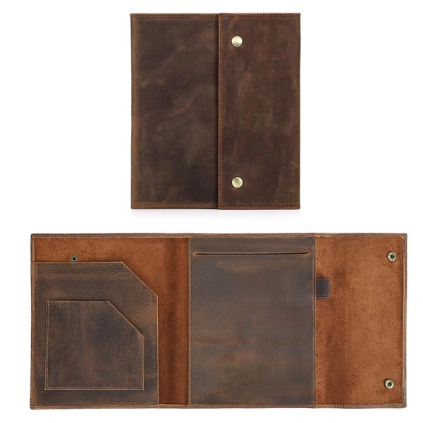 - TRAVEL FRIENDLY DESIGN - With its compact A5 size, this notebook leather case is easy to carry and fits perfectly in your pocket or backpack. Whether you are traveling on the plane, train or outdoors, it is the ideal accessory for writing down thoughts, creating art or taking notes. Designed with convenience in mind, the elastic pen loop holds your writing instrument of choice, be it a pen. It is the ideal feature for on the go to ensure your pen is always within reach.