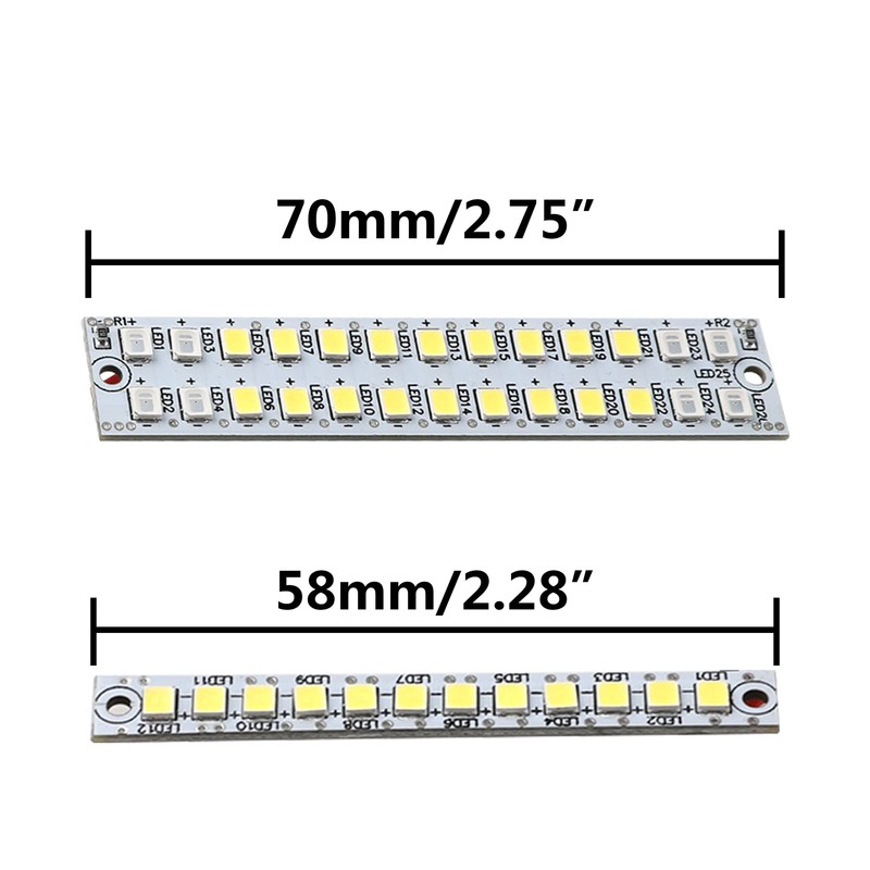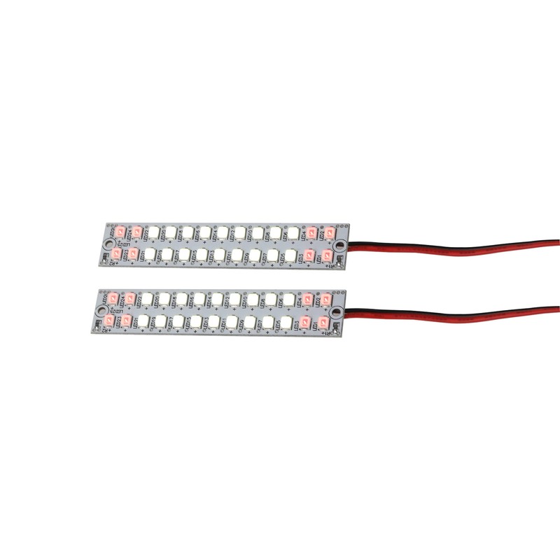 - 4.Size: Front Bumper Light Led Lenght: 58mm; Rear Bumper Light Led Lenght: 70mm. Led Quantity: 38Pcs; Led Light Color: White & Red; The front bumper light uses a single row of 12 white LED lights. The rear bumper light is composed of 18 white and 8 red LED lights in double rows.
