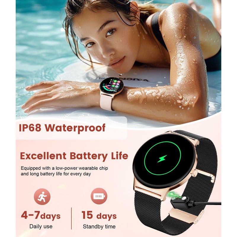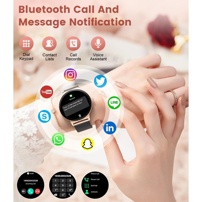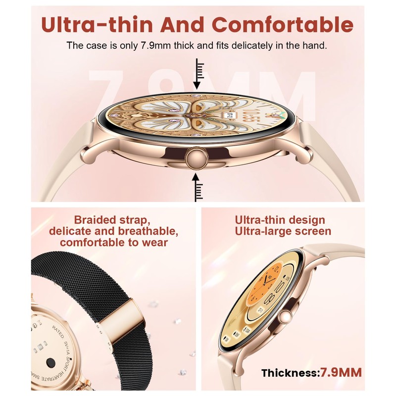- ✨️【Ultra Thin Women's Smartwatch】 The smart watch for women redefines wrist aesthetics with its breakthrough 5mm slim body. Like a light moonlight lightly kissing your wrist, this ultra-thin women watch perfectly blends into every delicate moment. The ultra-thin body made of high hardness and high-quality metal not only maintains elegant strength, but also brings unparalleled wearing comfort.