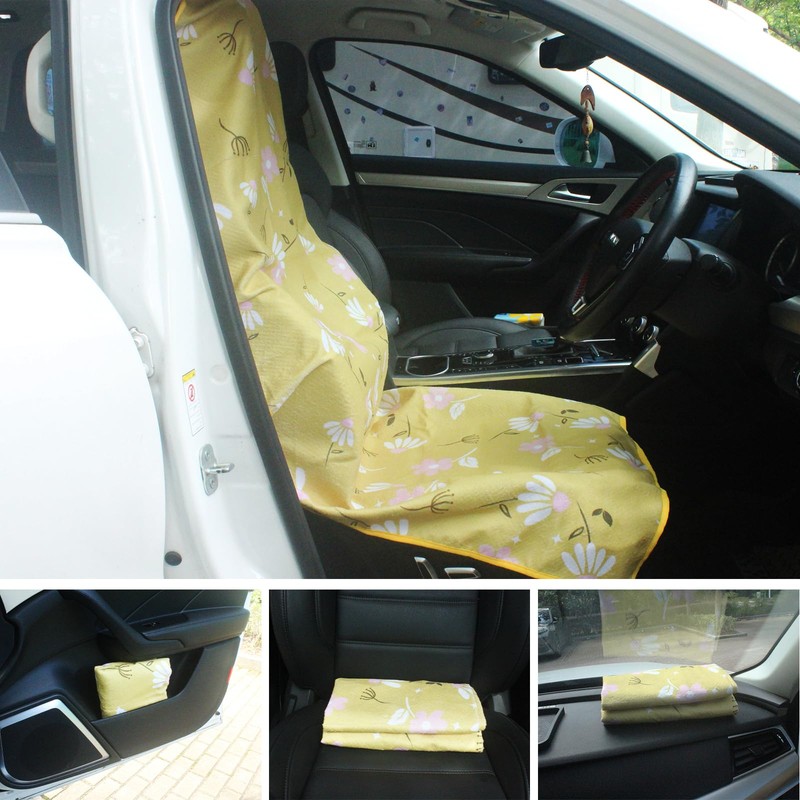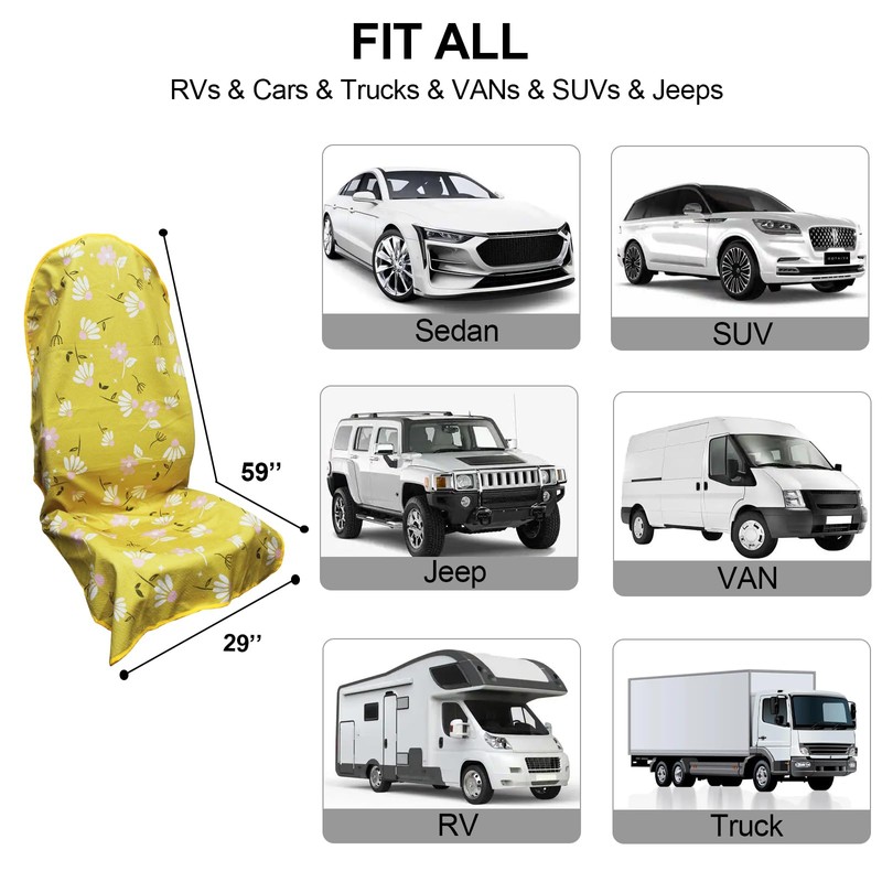Built with 3-Layer Protection: Top Layer (Comfort & Style): Soft, absorbent towel cloth featuring a classic Chamomile and Yellow print. Keeps your car seats fresh and catches the initial grime. Middle Layer (100% Waterproof): Seat protector guard your seats against sweat, moisture, spills, and anything else thrown its way. Bottom Layer (Stays Put!): Non-slip, comfortable backing fabric that grips your seat securely. No more sliding or bunching up during the drive! Full Coverage Protection (29.5" Wide x 56" Long): Hirritale car seat towel sized to cover your entire bucket seat – back and bottom – shielding it from sweat, mud, grease, clay, mystery stains, pet paws, and odors. Universal Fit: Features adjustable elastic straps that easily secure it around most vehicle seat shapes and sizes for a custom, slip-free fit. Fits all single seats with a headrest!A Must Have Seat Cove. Easy Install (& Remove!): The bucket seat cover simply loop the strong elastic band around the seat base, drape the cover over the headrest, adjust the straps, and you're done! Takes seconds. Convenient Storage: Rolls up neat and small. Tuck it into your door pocket, glove box, center console, or trunk – always ready for action. Perfect For: Gym trips,muddy hikes, beach days, pets, kids' snacks, coffee spills – basically, real life.