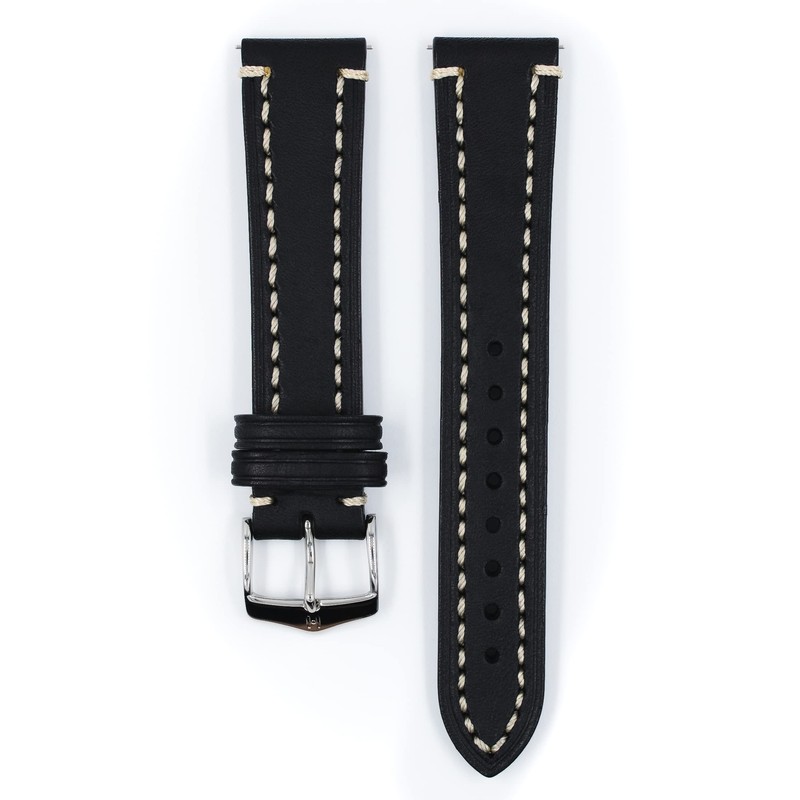 Robust strap made from one piece of leather. Contrasting stitching in manufactory style. Decorative latch seam on the clasp and watch base. Distinctive embossing line on strap and loops. High-quality stainless steel clasp in HIRSCH Classic design