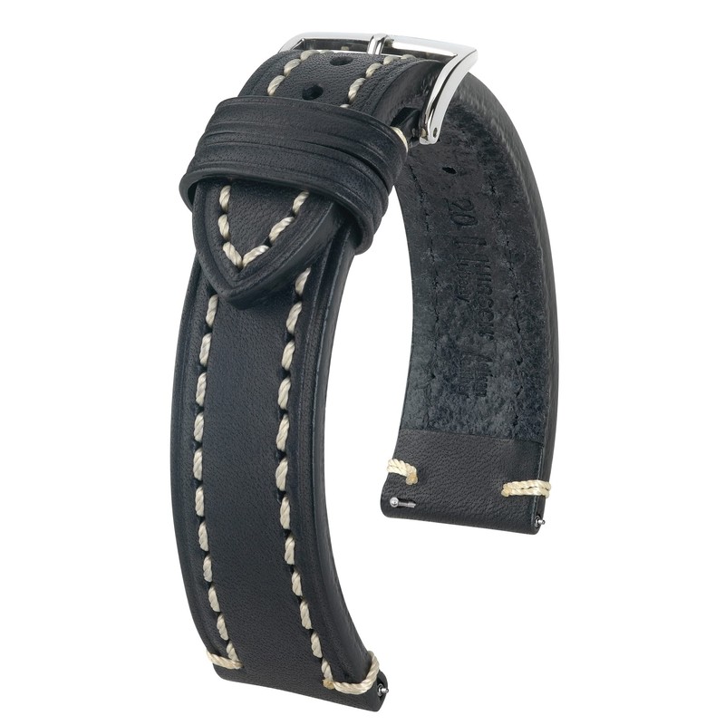 Robust strap made from one piece of leather. Contrasting stitching in manufactory style. Decorative latch seam on the clasp and watch base. Distinctive embossing line on strap and loops. High-quality stainless steel clasp in HIRSCH Classic design