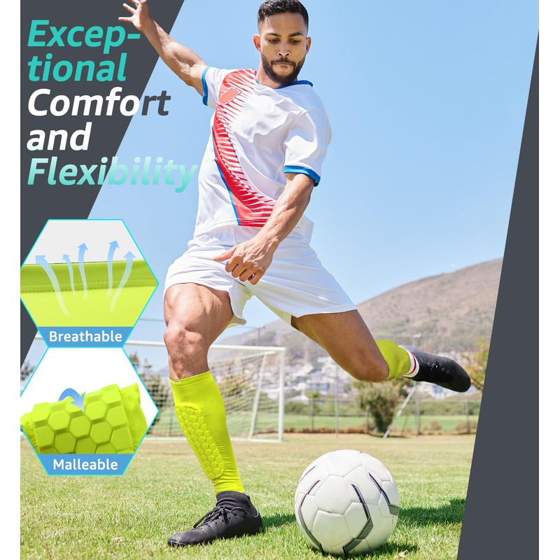 - Enhanced Protection with Advanced Design: Our shin guards feature a state-of-the-art honeycomb design for superior impact absorption and force dispersion, ensuring your shins are protected during intense play. The honeycomb padding molds perfectly to your shins, offering maximum flexibility and protection. Built-in anti-slip silicone strips keep the guards in place during dynamic activities, while flatlock seams offer a smooth, chafe-free fit that remains secure throughout your activities.