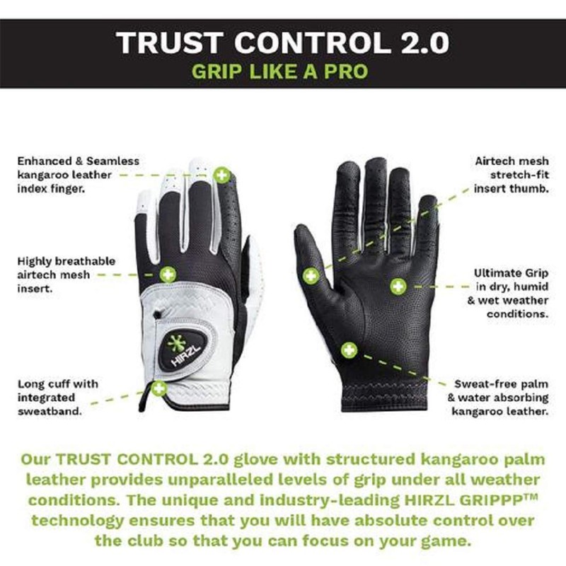 The TRUST CONTROL 2.0 glove with kangaroo leather palm provides you with unparalleled levels of grip under all weather conditions. The unique and industry-leading HIRZL GRIPPP technology ensures that you will have absolute control over the club so that you can focus on your game.