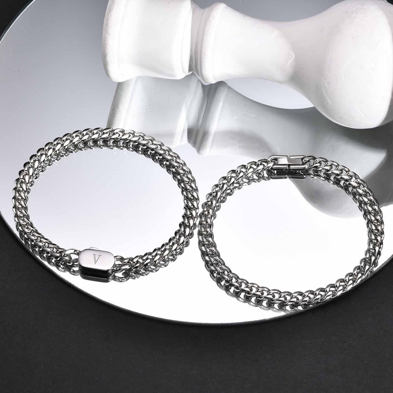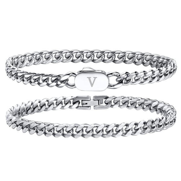 - đă2 Pcs V Initials Bracelet for MenăSet of 2 silver men's initials bracelets for men, these are designed for men. The Cuban stainless steel bracelet for men is a highly popular and meaningful piece of jewelry. You can choose letters to signify your name, favorite initials, parent's names, lover's friend's initials. Wearing an initial bracelet is a classic way to make a statement!