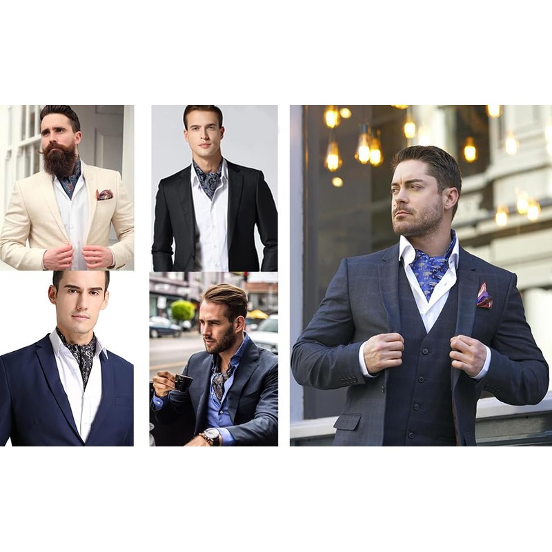 1.Premium Material:High-quality 1400 stitches jacquard woven silk scarf is clear and three-dimensional in pattern, with rich color and gorgeous luster, no fading or deformation after washing. 2.Style:Retro paisley cravat/Classic solid color cravat/Fashion plaid cravat/Vintage jacquard cravat/Casual dot cravat,there must be one that suits you,essential accessories for men's wardrobes. 3.Package Contains:Men's Cravat Tie + Pocket Square.Suitable for daily, wedding, banquet, anniversary, business, dating, party or prom. 4.Good Matching:Vintage paisley mens ascot tie, available in red/blue/green/pink/gold/purple/silver/black/white, it can be paired with any top in your closet for a glamorous look.