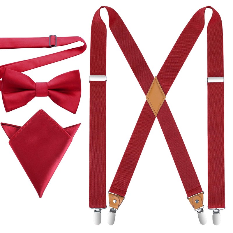 HISDERN Braces for Men X Shape with Very Strong Braces and Bow Tie with Pocket Square Set, Red--3