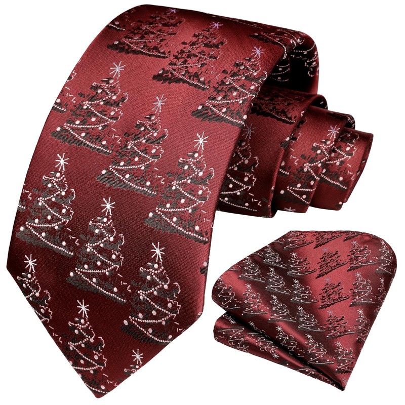 HISDERN Christmas Mens Ties Burgundy Xmas Tree Pattern Tie and Pocket Square Holiday Season Funny Neckties Handkerchief for Party