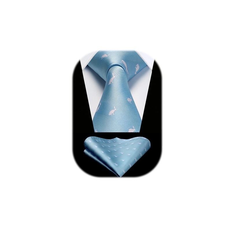 HISDERN Light Blue Tie for Men Rabbit Pattern Ties Handkerchief Novelty Animal Print Wedding Necktie & Pocket Square Set