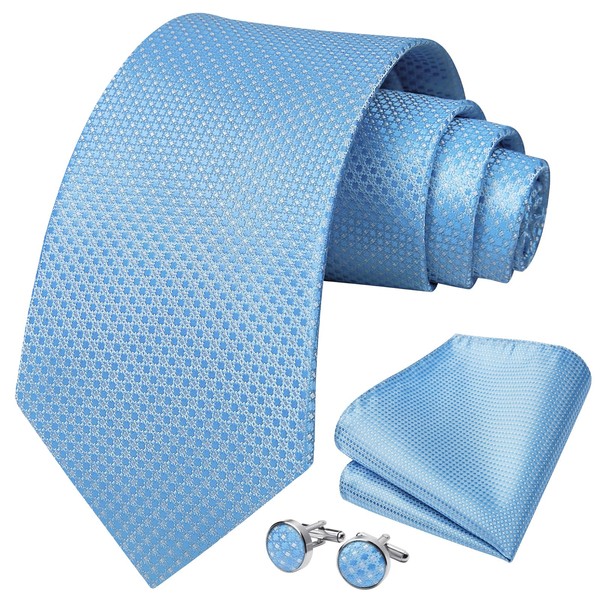 HISDERN Men's Wedding Ties and Pocket Square Solid Tie Cufflinks Set, Check Blue