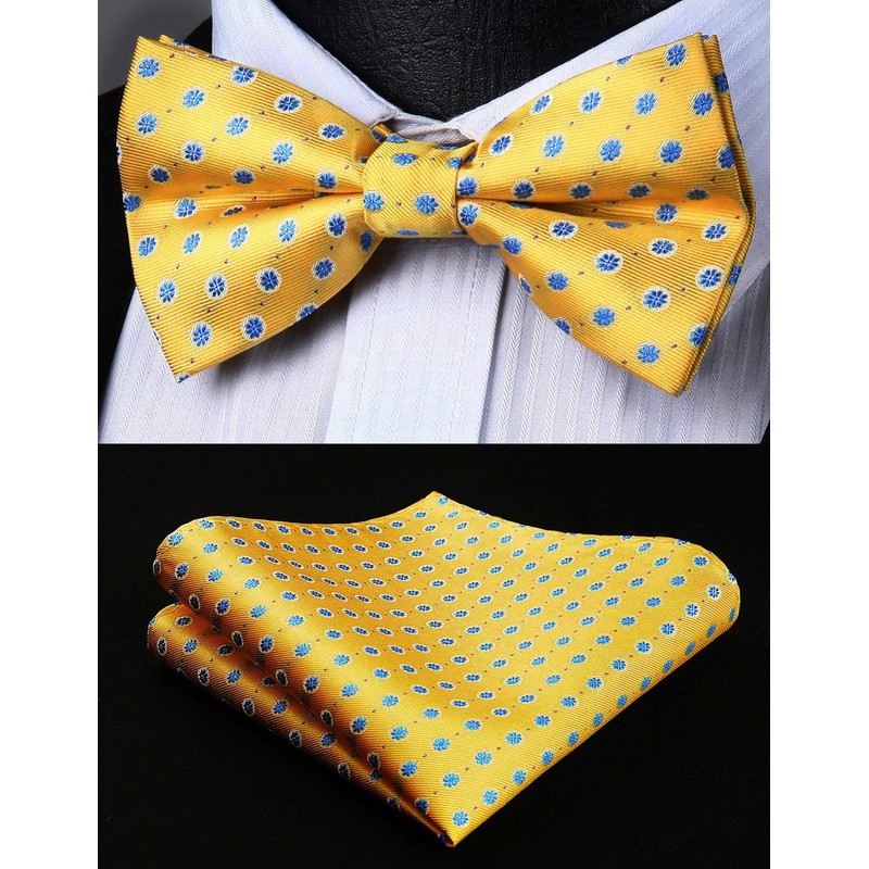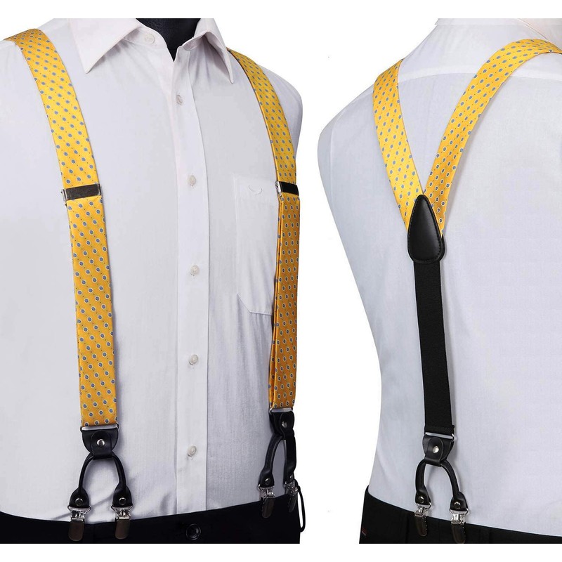 HISDERN Suspenders Bow Tie Set for Men Yellow Polka Dot Bow Ties and Suspender & Pocket Square Y Shape 6 Clips Adjustable Braces