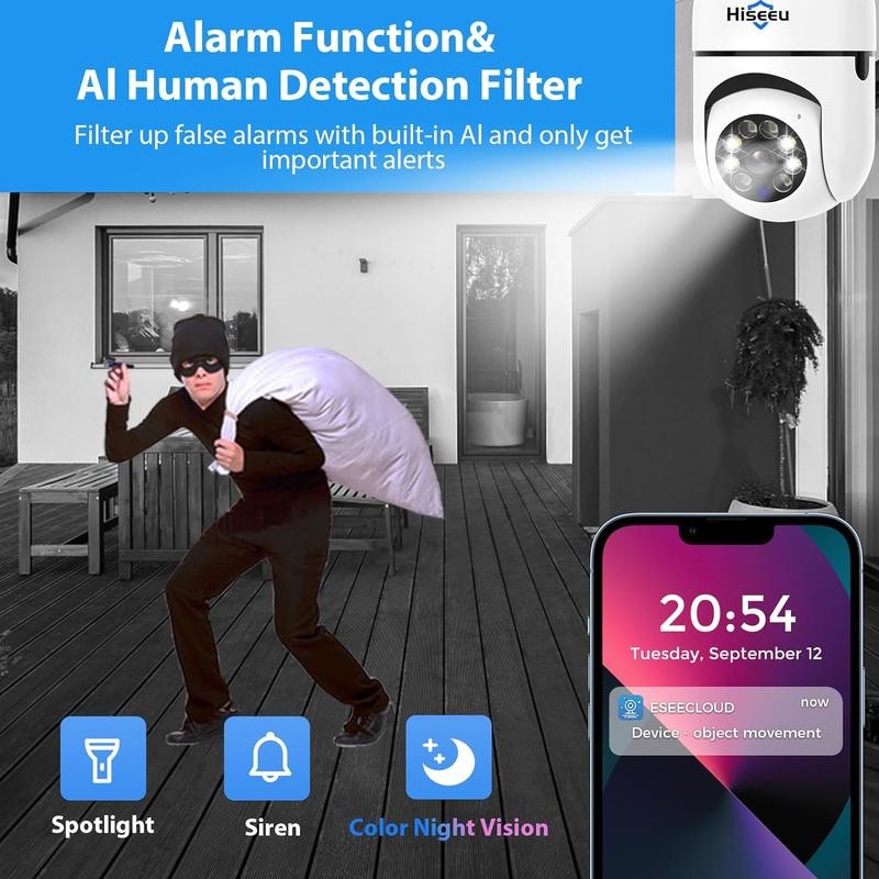 Hiseeu 2.4G WIFI Wireless Light Bulb Security Camera with SD CARD, 3MP PTZ Full Color Night Vision, 2-Way-Audio, Motion Detection Alarm spotlight siren live view camara para - CAMERA: 2 PACK