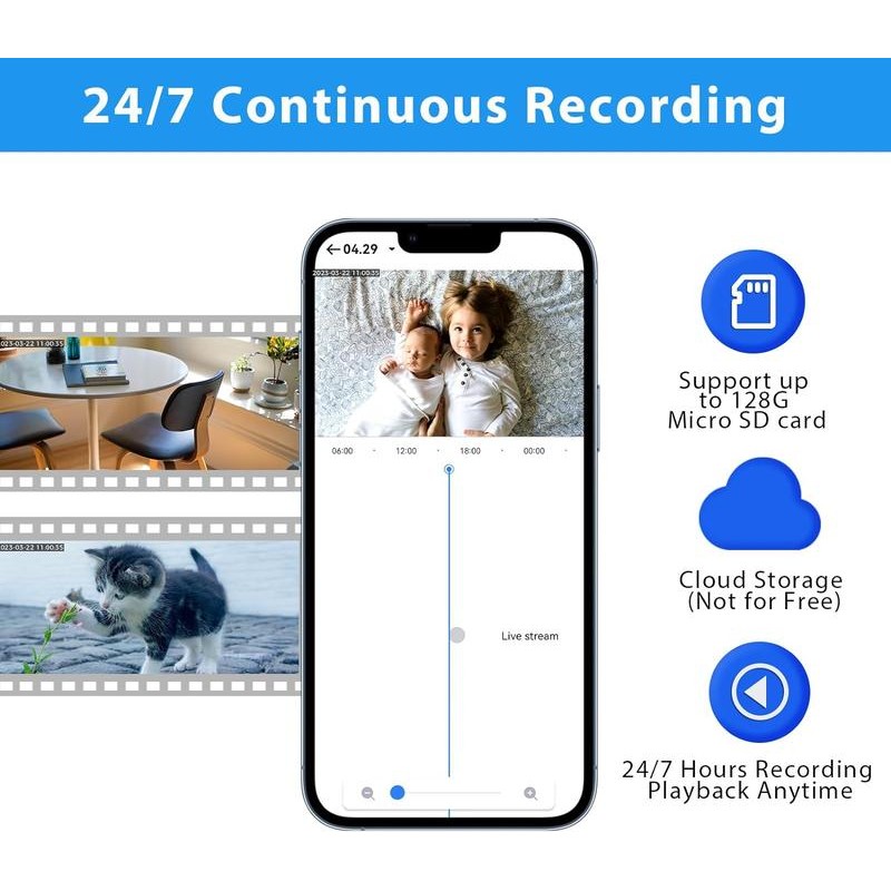 6.Two-Way Audio & 24/7 Recording Includes a built-in microphone and loudspeaker which allows you to talk with children, guests, mail deliver couriers, etc. Supports 24/7 continuous recording, all videos can be saved to a Micro SD card (with 32GB SD CARD) or the cloud.