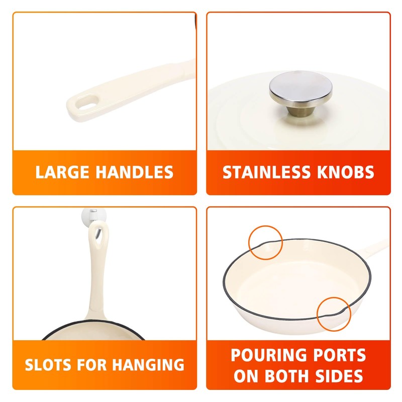 • [Rust-proof & Durable Safe Coating] - The cast iron cookware set boasts a meticulous 5-layer coating system: a robust cast iron interior, fortified with 2 layers of base glaze for stability, and crowned with 2 layers of exterior enamel for a beautiful Cream White finish. This enamel coating is not only crack- and scratch-resistant but also features advanced rust-proof properties, ensuring long-lasting durability. Completely free from PFOA, PTFE, lead, and cadmium, this cookware set is your ideal companion for healthy, worry-free cooking.