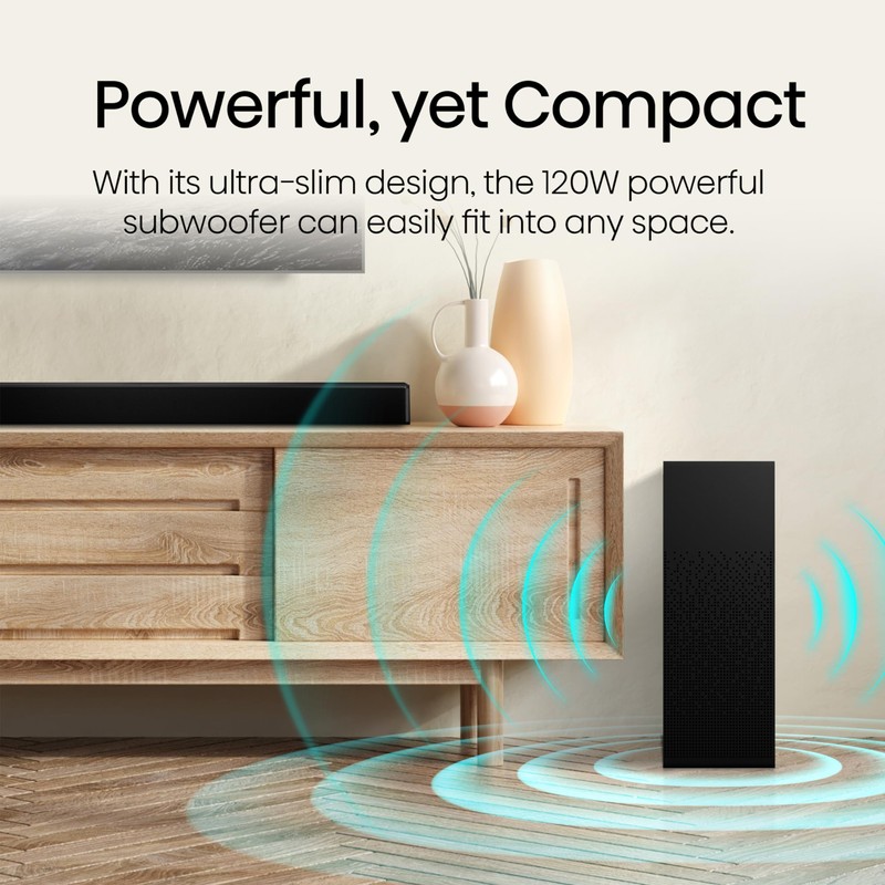 - Wireless Subwoofer: A wireless subwoofer delivers the robust low-end frequencies that punctuate your favorite movies, music, and games, without any messy wires. You’ll feel the “boom” while the two front- facing speakers project bright, clear high- and mid-range frequencies.
