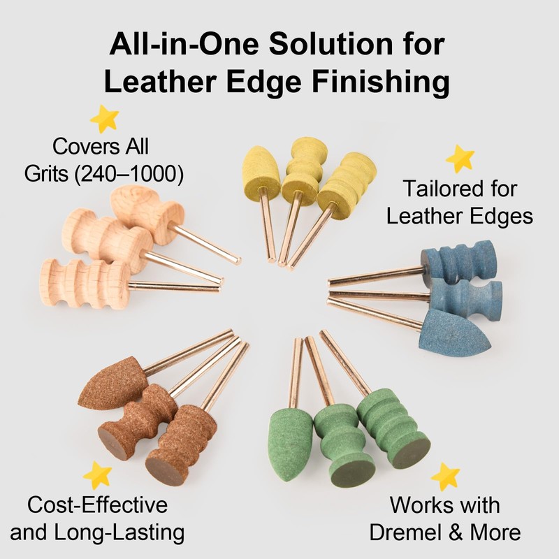 • 【COMPLETE SET FOR MULTI-STAGE EDGE FINISHING】Includes 12 rubber sanding bits (240, 400, 600, and 1000 grit) for progressive smoothing, plus 3 beechwood bits that use friction to seal and polish leather edges to a natural finish