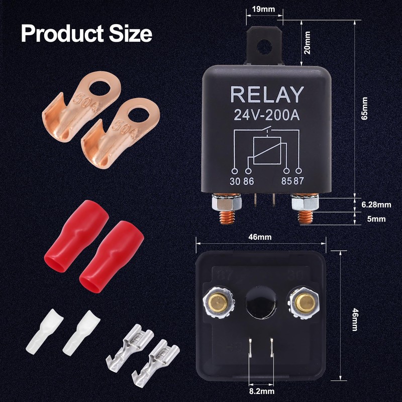 - Package includes: 1*4 pin 24 V 200 A Heavy Duty Split Charge On/Off Relay, 4*terminal, 2*red guard
