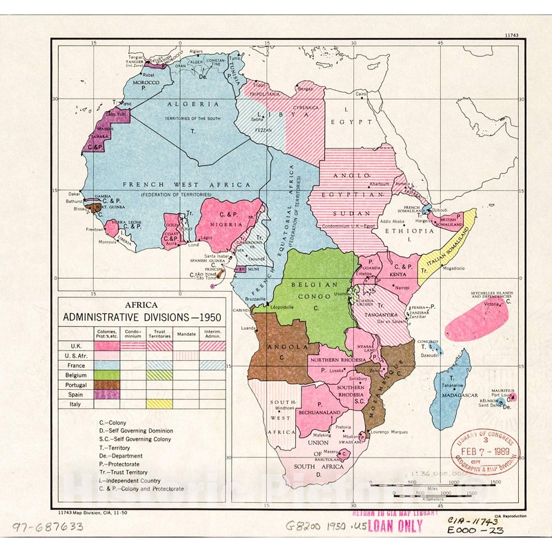 Historic 1950 Wall Map - Africa, Administrative divisions, 1950. 16in x 16in