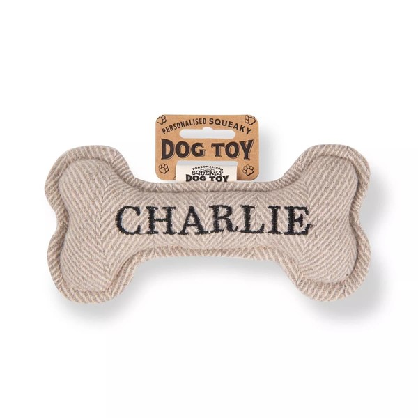 - Pre-personalised squeaky dog toy.
