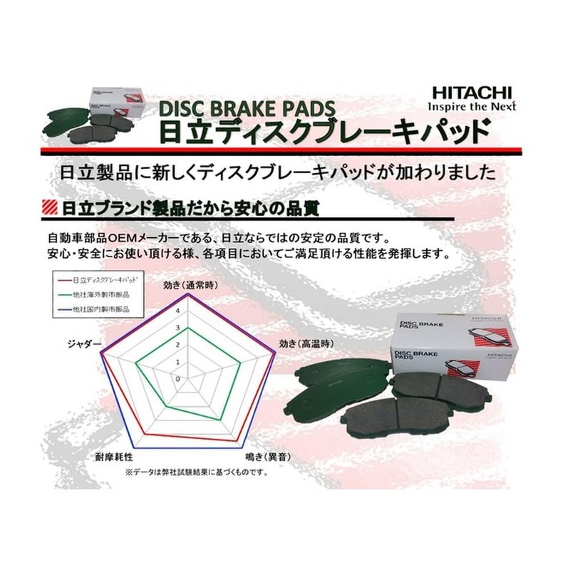 - Hitachi brake pads are made of high quality friction material, which is less likely to cause this phenomenon, and the coefficient of friction is stable from the beginning of brake to the end of the temperature of the pad is increased. It maintains excellent stopping performance even if you use heavy brakes on long downhills, and the driver can control the deceleration as desired