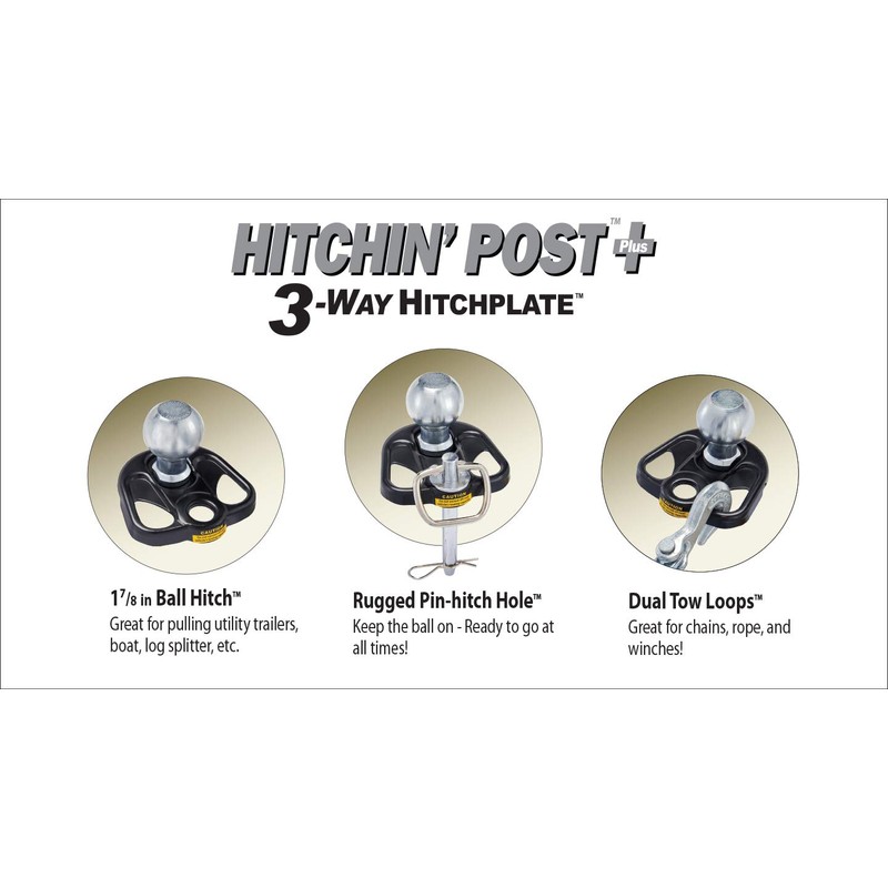 **Good Vibrations 175 Hitchin’ Post Plus - 3 Way HitchPlate Includes 1 - ⅞” Ball - Hitch for Boat Trailer, Snow Machines, Gardening Carts - Powder Coated Finish **** The Hitchin Post PLUS+ 3-way hitch plate and towing ball turns your lawn tractor or ATV into a workhorse. It easily mounts to your equipment, making it easy to use a pin hitch, a ball hitch and dual tow-loops without ever having to remove the ball or change hitches. It's always ready to go, whenever you need it.**