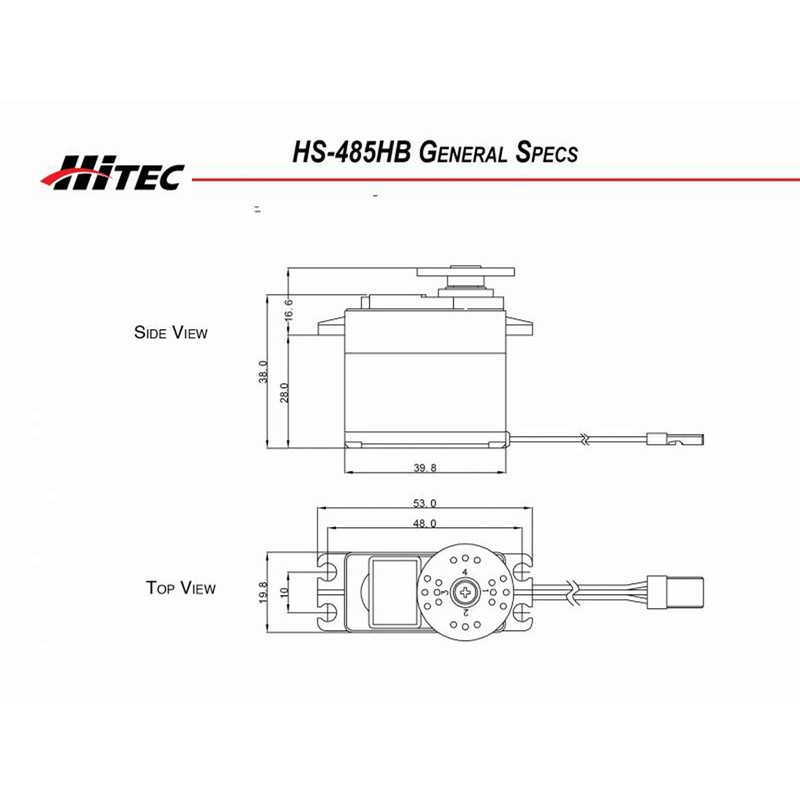 The HS-485HB updates the very popular HS-475HB by adding more torque and greater speed. With its top ball bearing, heavy duty, high impact Karbonite™ gears and high performance circuitry, the HS-485HB offers lots of torque and features excellent centering and resolution. Great for Heli's and Aircraft up to 72” or up to 12lbs when using just one servo per control surface. Be aware that high vibration gas (not glow) engines combined with large control surfaces and large throws (3D models) can put undue strain on the gears. Metal geared servos are recommended for these applications even if under 12lbs. Warning: Do not use thread lockers on Karbonite geared servo as it will cause the output shaft to fail.