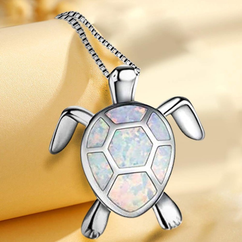 Hithop Cute Turtle Pendant Necklace Lovely Animals White Fire Opal Plated Silver Necklace Jewellery Gifts (White)