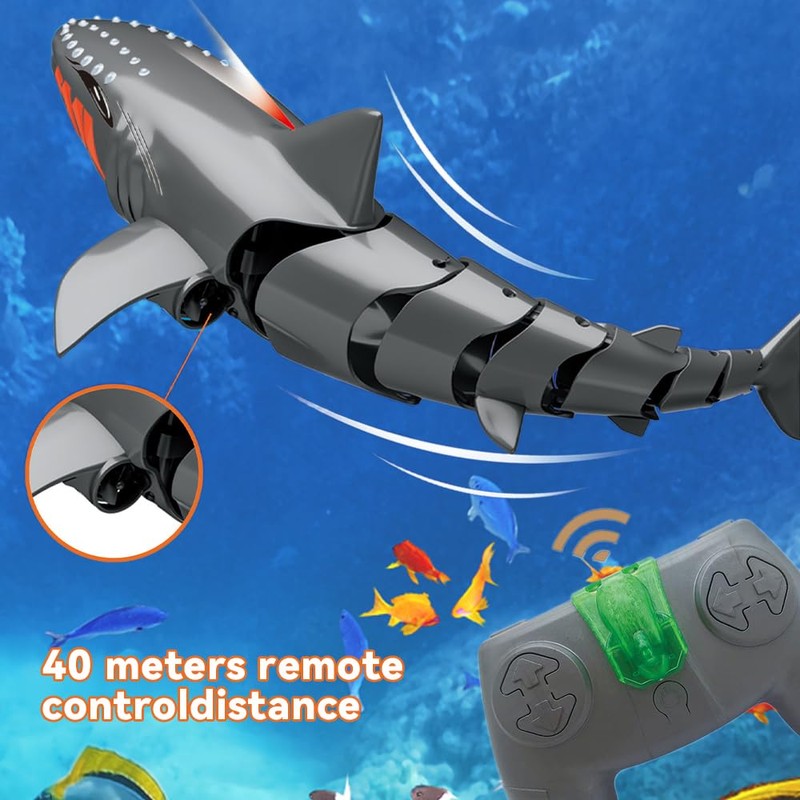 - Propulsión de Doble Hélice:Figura aerodinámica con juntas de cola mecánicas flexibles, diseño de paletas dobles y tecnología de sellado estricto... todas las características aseguran suficiente potencia para que el tiburón se balancee hacia la derecha y hacia la izquierda libremente como en la realidad, brindando ensueño y diversión ilimitados para niños.