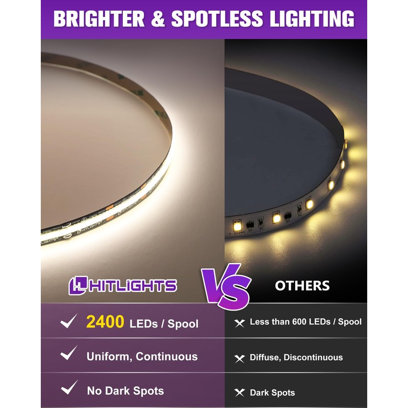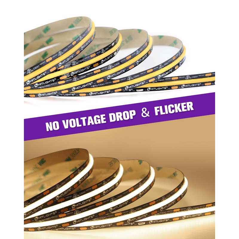 - 12V COB LED LIGHT STRIP: HitLights COB LED light strips are the ultimate in energy efficiency, high brightness, and even lighting. These LED strip lights leave smooth and spotless lighting where hot spots are eliminated and appear as one single light