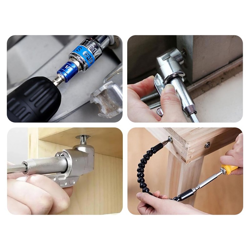 - Angle screwdriver attachment set: Aakku screwdriver socket adapter set contains 3-piece 1/4 inch hexagonal shaft magnetic extension chuck adapter quick release socket screwdriver bit holder, flexible shaft bits drill extension. Suitable for electric, pneumatic screwdriver and other screwdriver bits of power tools, drill extended and more.