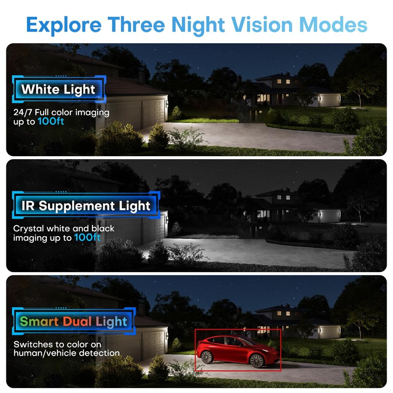 - Human/Vehicle Detection & Smart Color Night Vision: Harness deep learning technology for 98% accurate human and vehicle detection, significantly reducing false alarms compared to traditional cameras. In low-light conditions, this IP camera outdoor intelligently activates the LED lights when it detects a person or vehicle, minimizing light pollution perfectly for indoor use. Enjoy 98ft of clear infrared night vision or switch to Smart Color Night Vision for 24/7 full-color monitoring. Customize your vision mode with ease through the camera's webpage settings