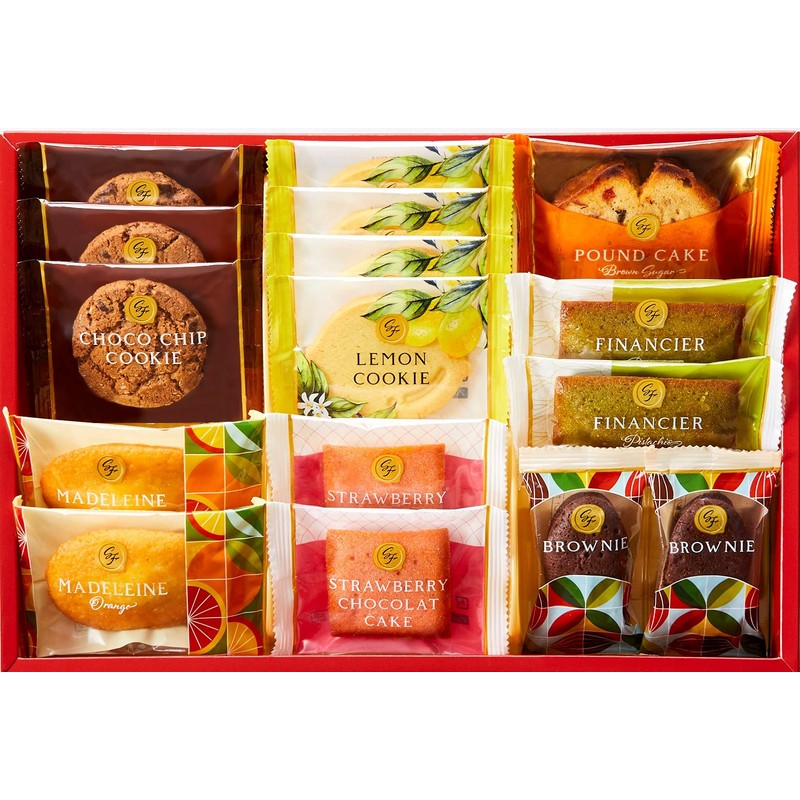 - 内容量:オレンジマドレーヌ2個、ストロベリーショコラケーキ2個、ブラウニー2個、ピスタチオフィナンシェ2個、ブラウンシュガーパウンドケーキ1個、チョコチップクッキー3個、レモンクッキー4個