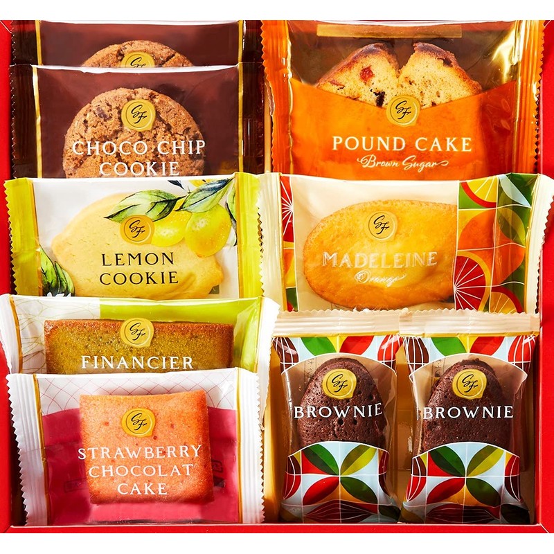 - 内容量:オレンジマドレーヌ1個、ストロベリーショコラケーキ1個、ブラウニー2個、ピスタチオフィナンシェ1個、ブラウンシュガーパウンドケーキ1個、チョコチップクッキー2個、レモンクッキー1個