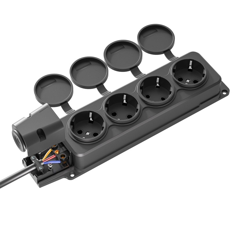 - 4-way Schuko socket distributor for short-term outdoor use: for outdoor, garden, wet room, indoor or industry, perfect for use outdoors or in the garden - the high-quality rubber insulation masters all weather conditions. Simply plug this adapter into a socket and you have two slots!